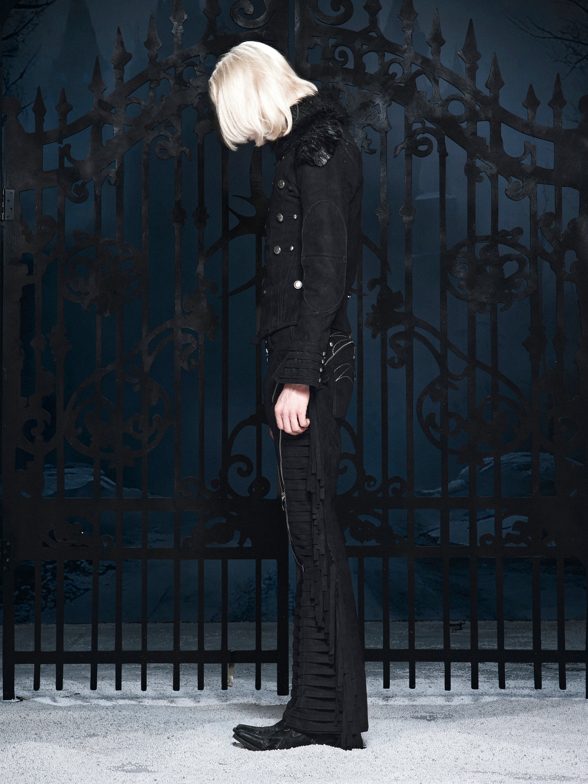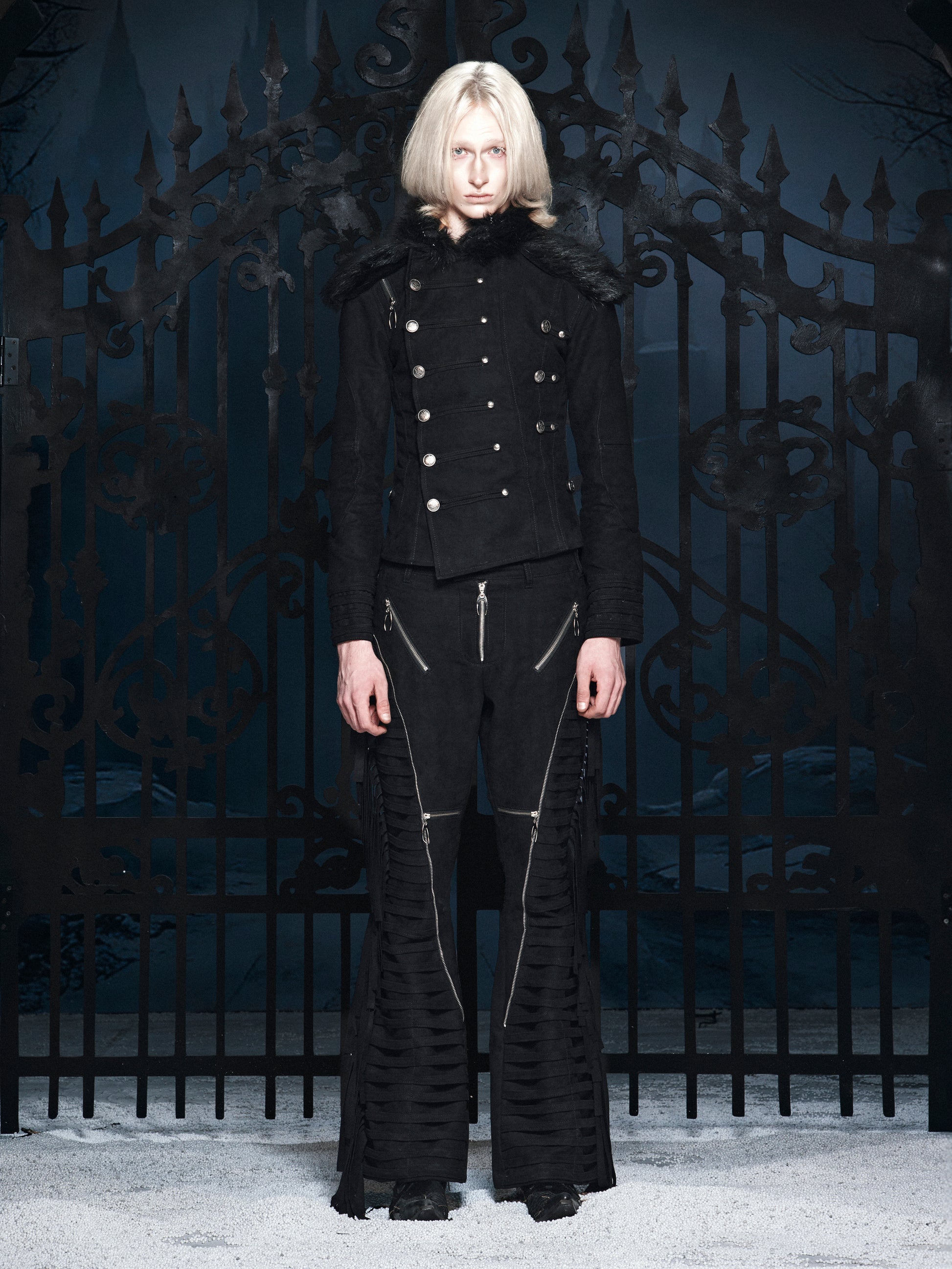 The fur collar adds primal dominance, while structured tailoring and ceremonial metal hardware evoke discipline, power, and rebellion.