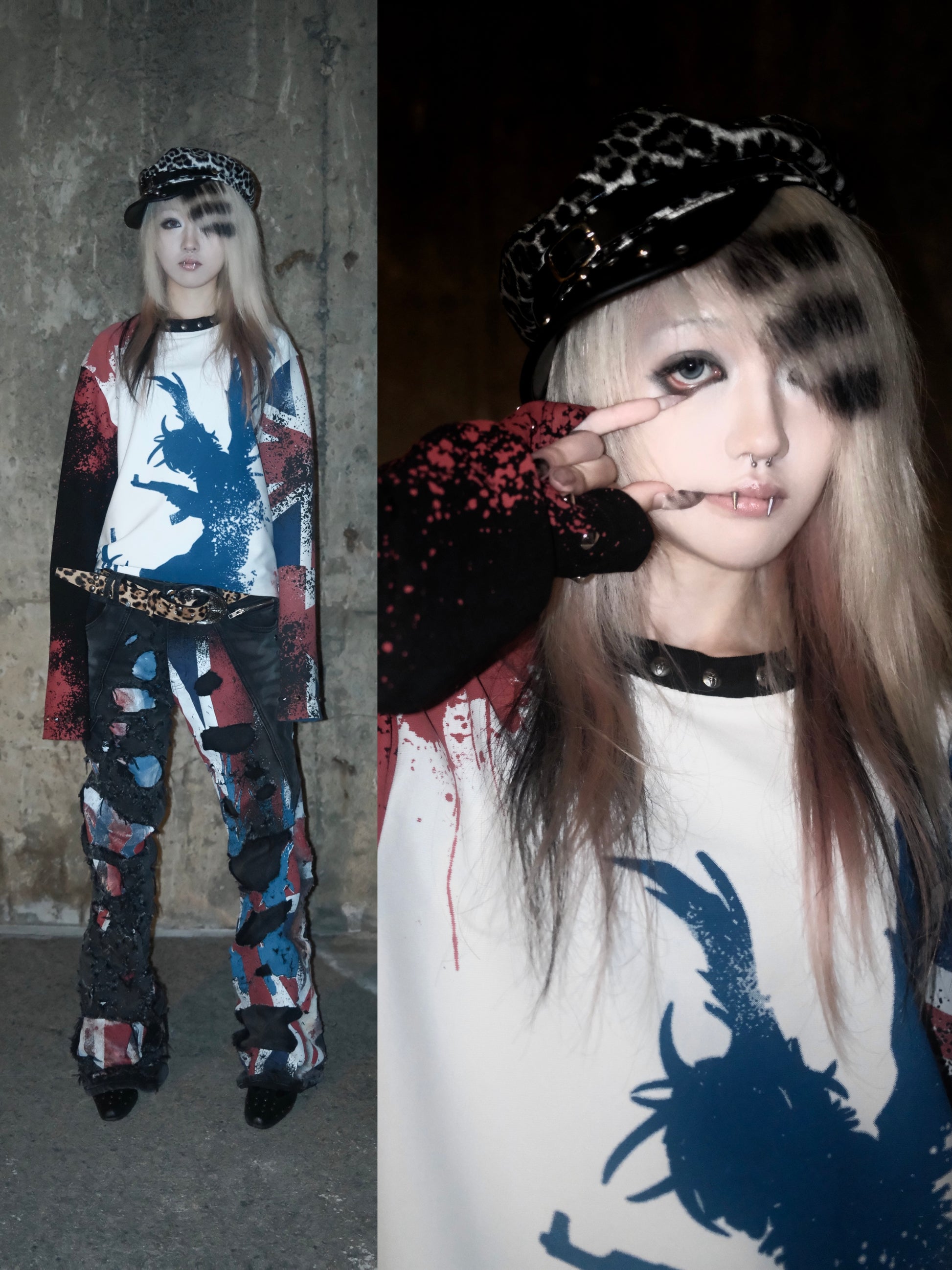 • Treated with paint-splatter technique symbolizing rebellion and self-destruction