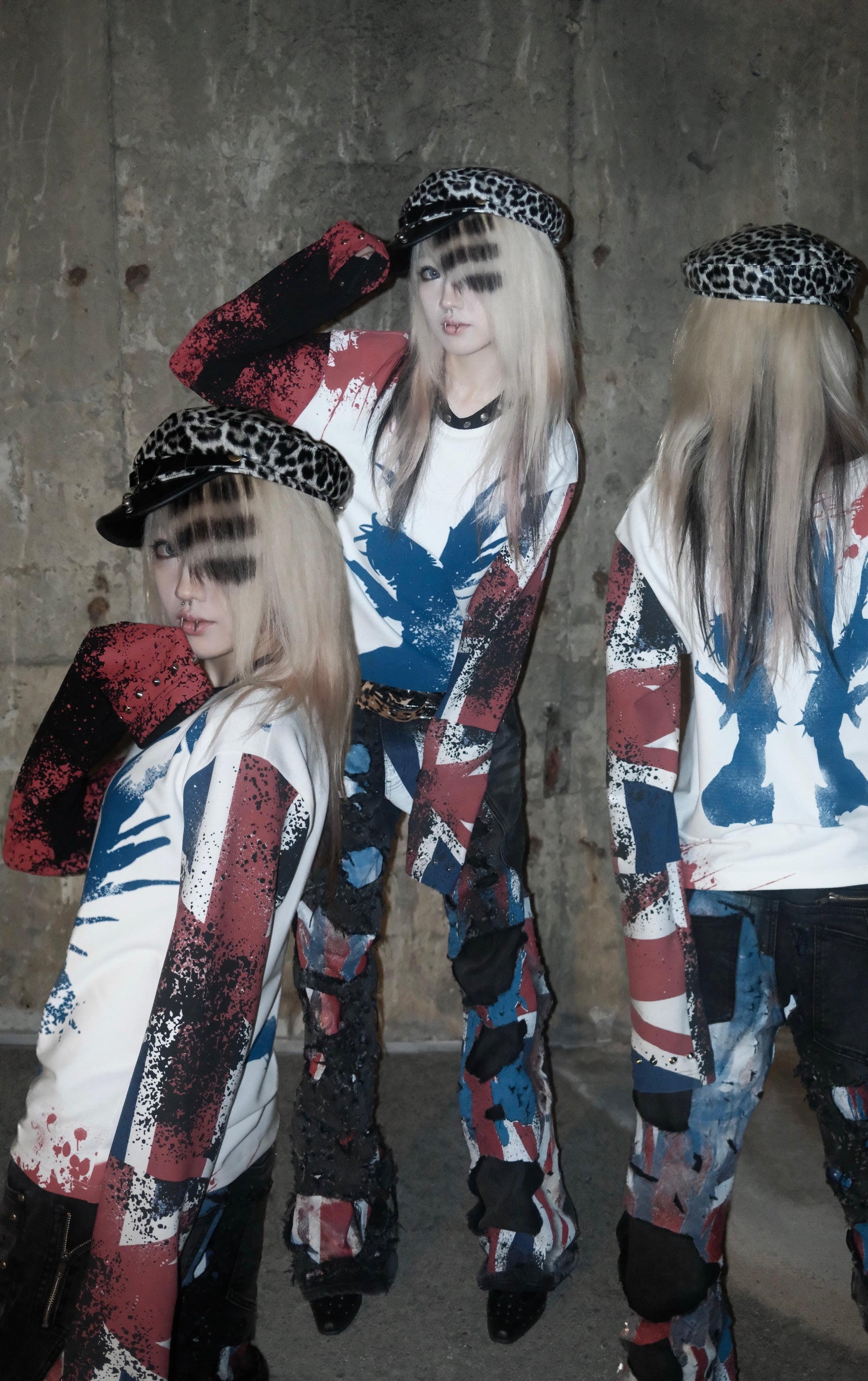 • COZY’s signature color palette — deep black denim contrasted with industrial red, white, and metallic blue brushwork