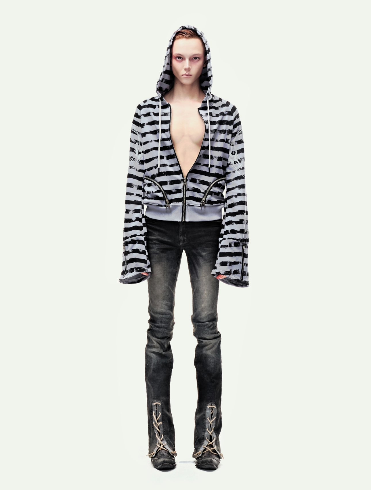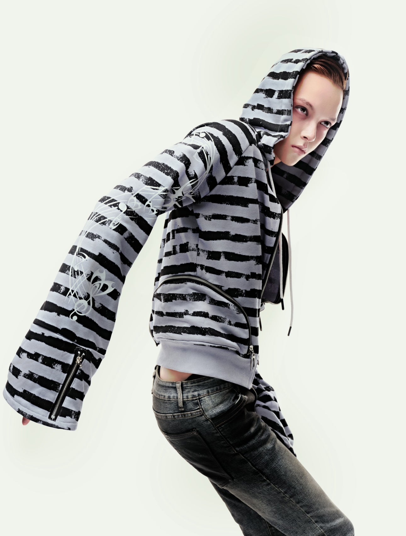• Cropped zip-up hoodie with irregular hand-painted stripe patterns inspired by digital noise and interference